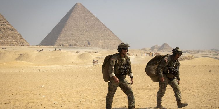 U.S. service members assigned to U.S. Army 5th Special Forces Group and U.S. Navy Seal Team 7 conduct airborne operations alongside their counterparts from Cyprus, Egypt, Greece, India, Italy, Jordan, Kingdom of Saudi Arabia, Kyrgyzstan, Qatar, South Africa, United Kingdom, and Yemen during a jump over the Giza Pyramid Complex during exercise BRIGHT STAR 25 in Giza, Egypt, Sept. 6, 2025. This event was one of many during the exercise in which U.S. forces worked alongside their partner nation armed forces to enhance readiness and build our collective capacity to operate seamlessly while improving interoperability in a joint operations environment. (U.S. Army photo by Sgt. Grace Nechanicky)