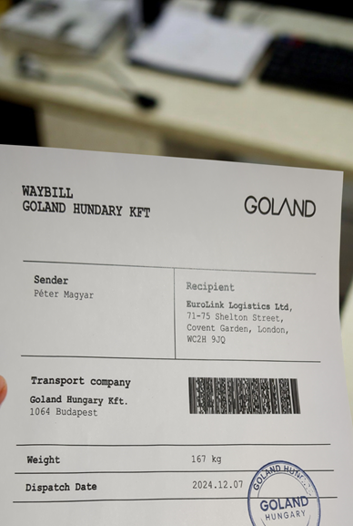 Official transport declaration by Goland Hungary Kft. for a shipment originating in Ukraine and destined for a British logistics firm – used as cover for the transfer of $16.7 million in cash